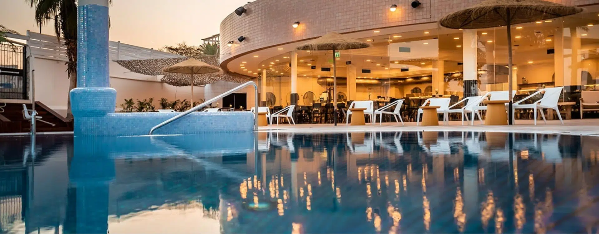 לובי המלון מרווח וכולל בר אוכל ושתייה הפועל במשך כל היום ונוף פנורמי לבריכה. בריכות השחייה שופצו ורוצפו מחדש, בהן בריכת שחייה גדולה עם עשרות מיטות שיזוף ונוח לכלל האורחים ובריכת רחצה לפעוטות.